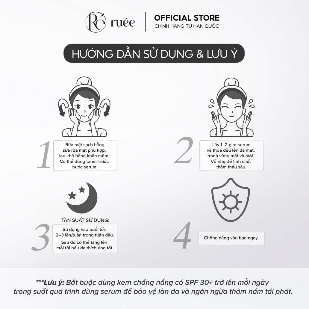 Bắt buộc dùng kem chống nắng có SPF 30+ trở lên mỗi ngày trong suốt quá trình dùng serum để bảo vệ làn da và ngăn ngừa thâm nám tái phát.