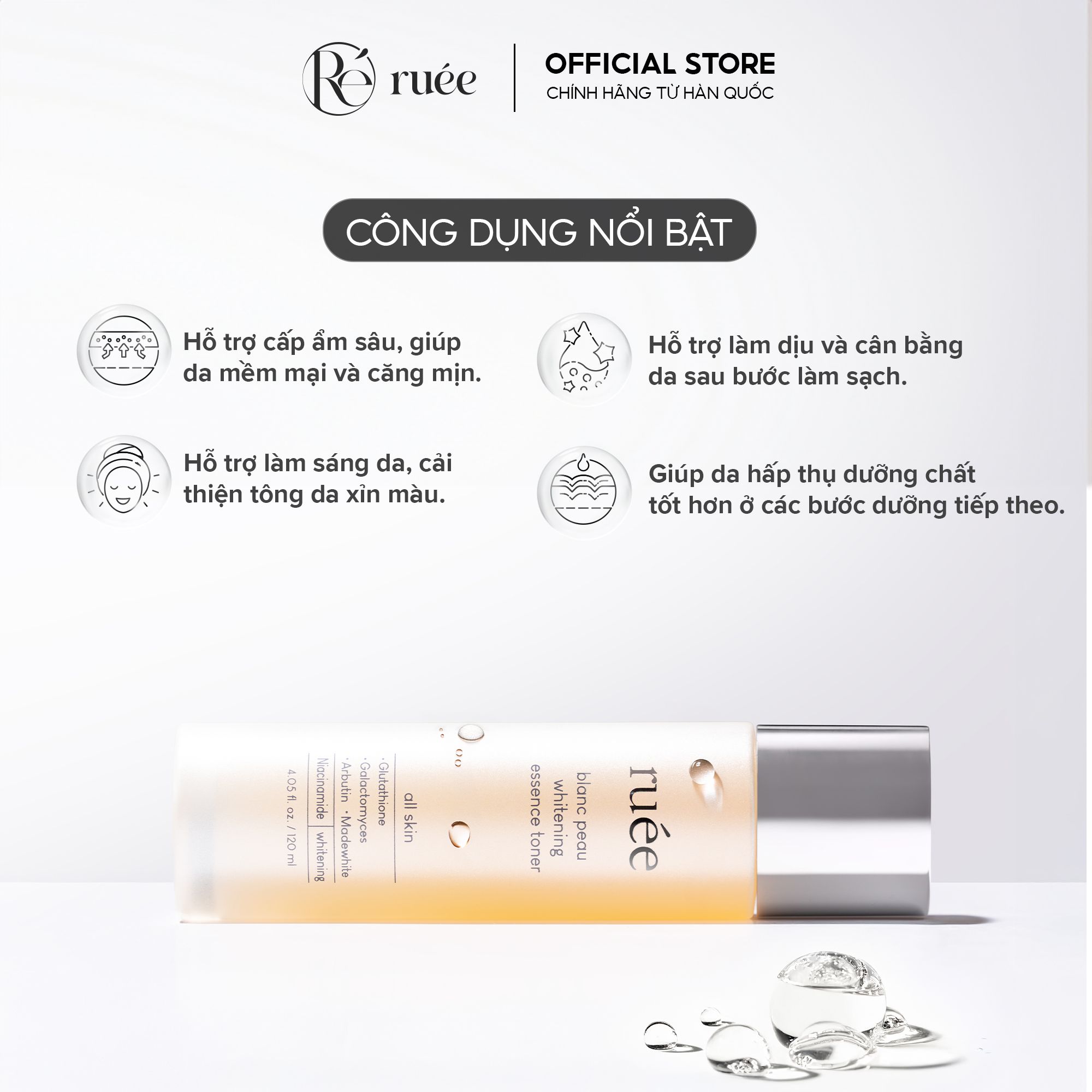Toner Dưỡng Ẩm RUÉE Blanc Peau Essence 120ml là bước đệm hoàn hảo giúp cấp ẩm, làm mềm da và hỗ trợ cải thiện tông da. Sản phẩm chứa các thành phần dưỡng chất thiết yếu giúp da căng bóng, tươi tắn, sẵn sàng hấp thụ dưỡng chất từ các bước chăm sóc tiếp theo.